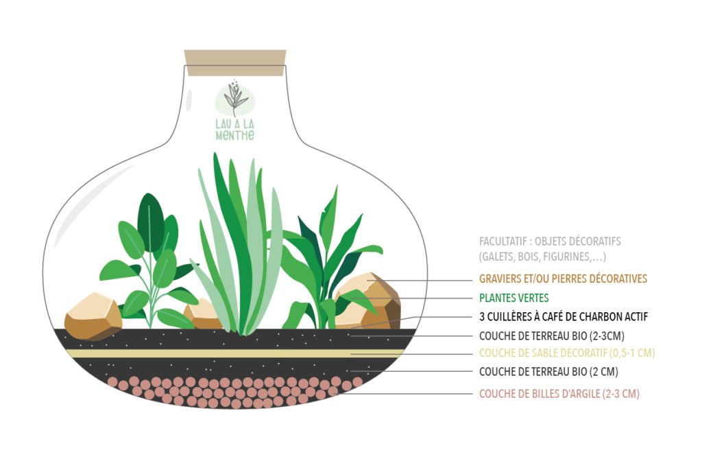 Un bocal ou un récipient en verre transparent est indispensable. Il peut être ouvert ou fermé selon le type de plantes choisies.